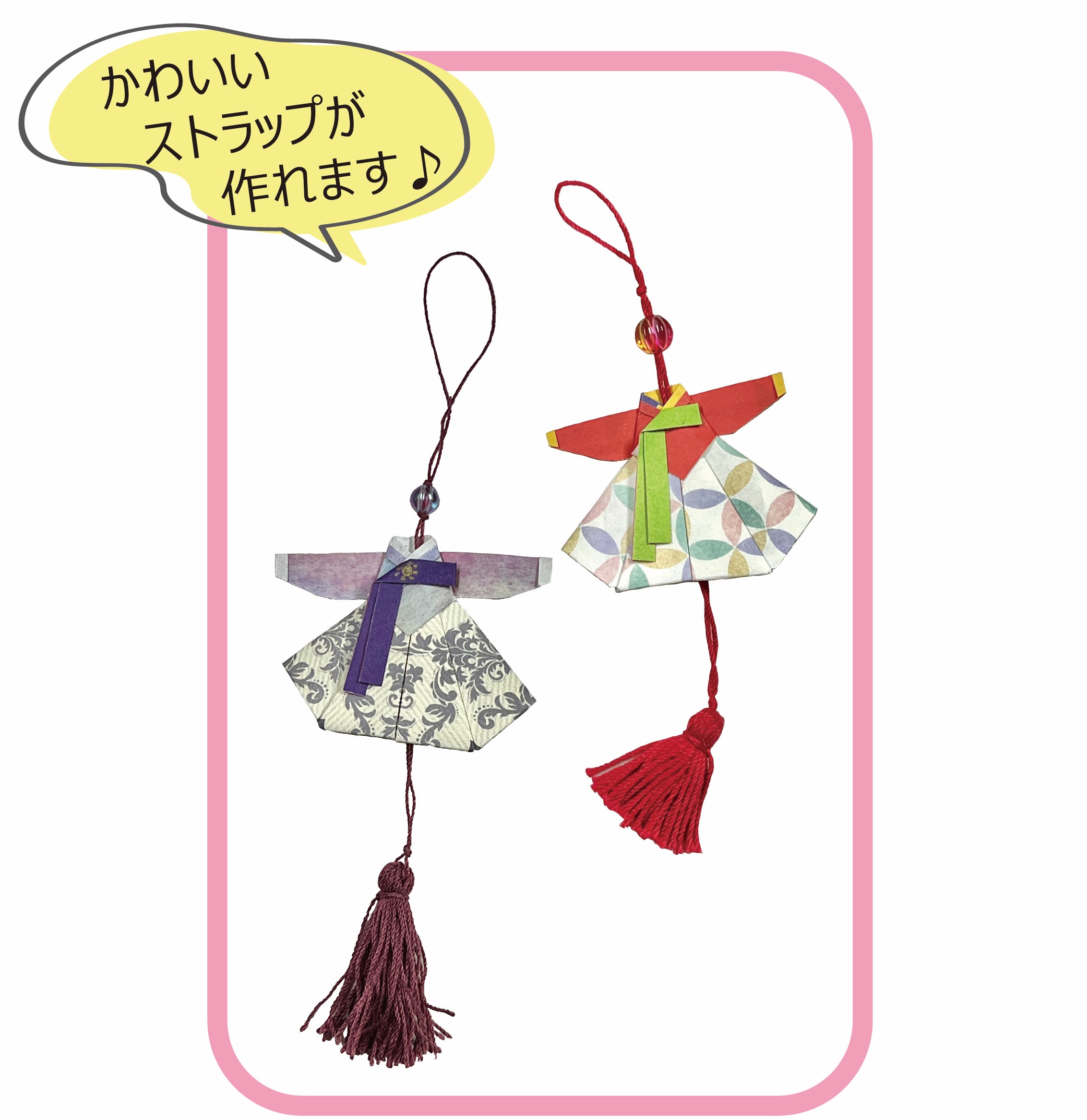 好きな折り紙を組み合わせてチマチョゴリを作成し、かわいいストラップに仕上げます。