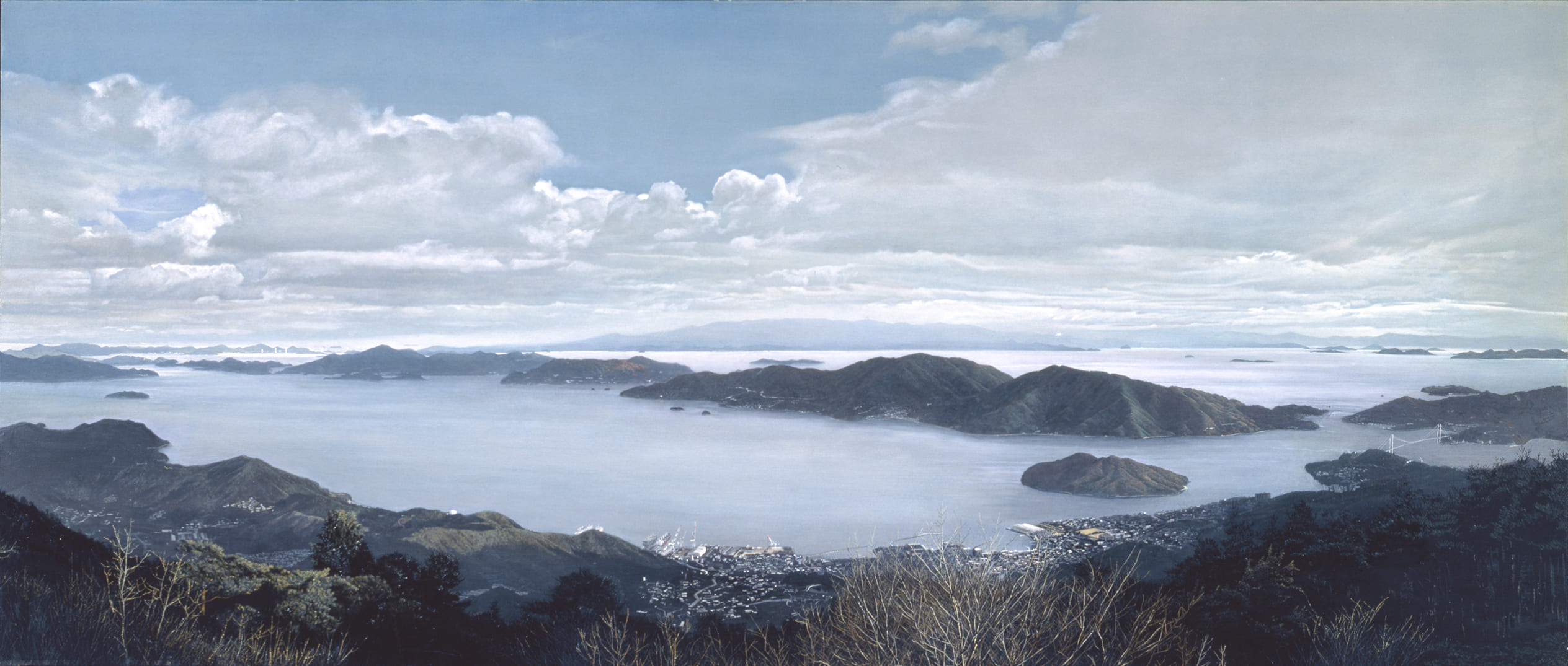 右:大畑稔浩《野呂山と瀬戸内海》油彩・キャンバス 97.0×227.3㎝ 1998年 (呉市川尻市民センター所蔵)