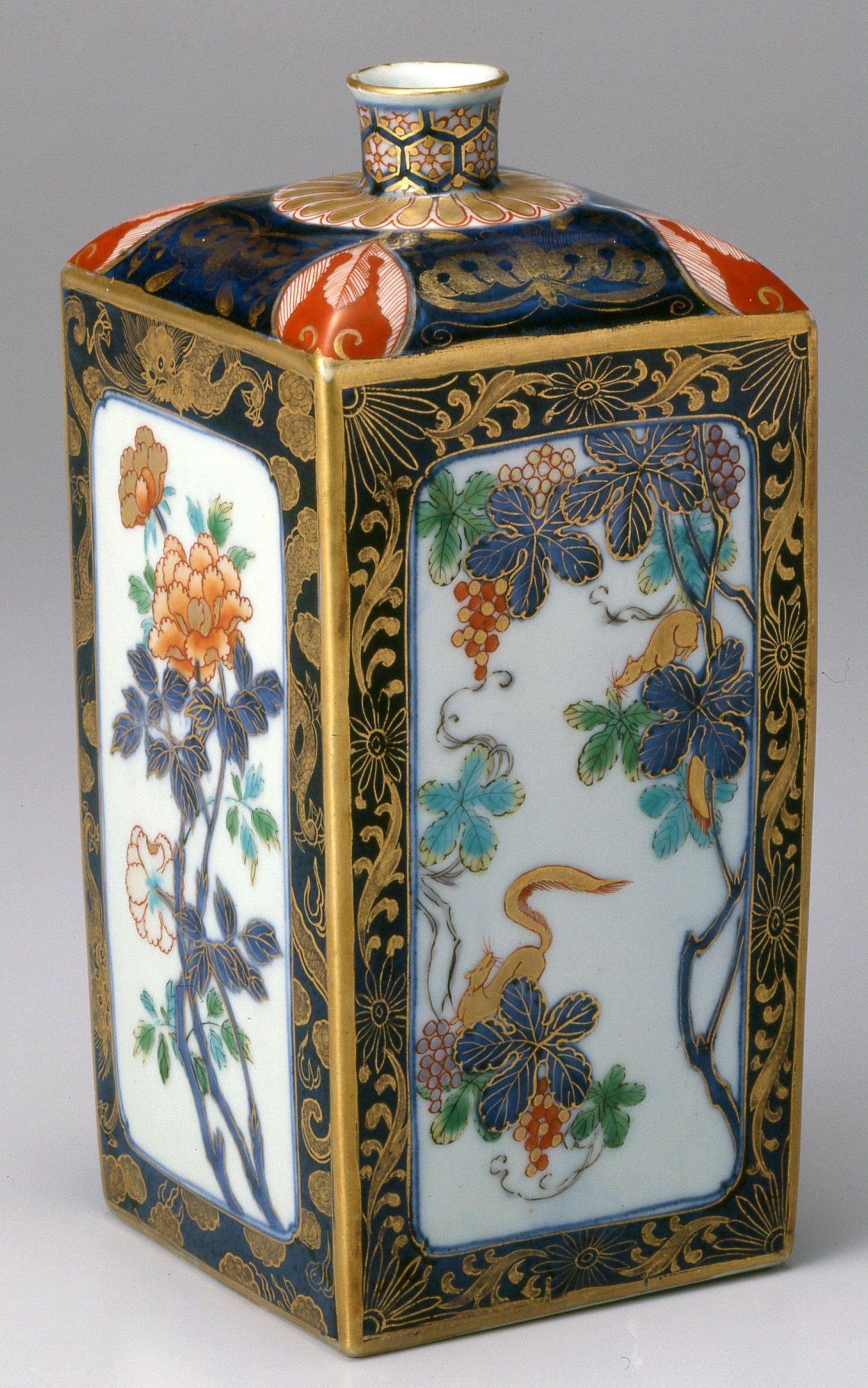「色絵葡萄栗鼠文角瓶」 1700-30年代 元禄様式