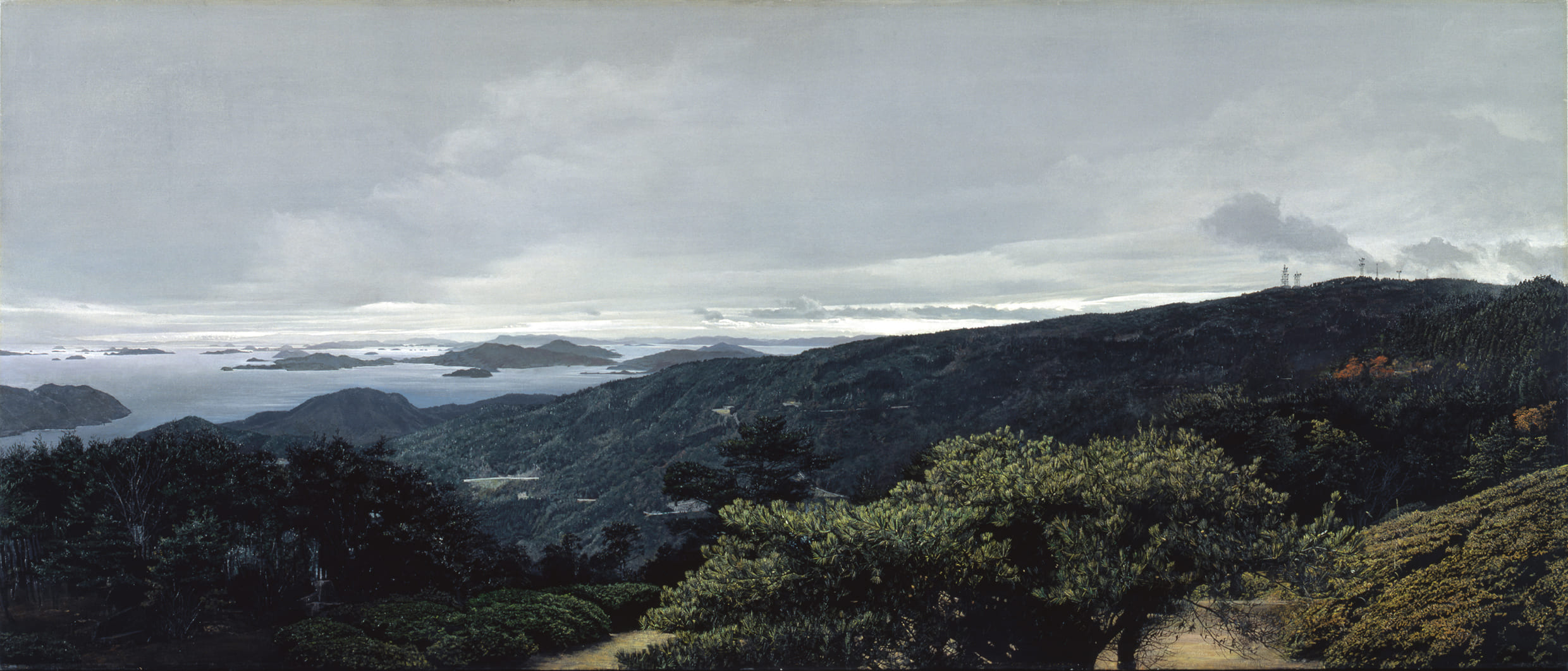 右:大畑稔浩《野呂山と瀬戸内海》油彩・キャンバス 97.0×227.3㎝ 1998年 (呉市川尻市民センター所蔵)